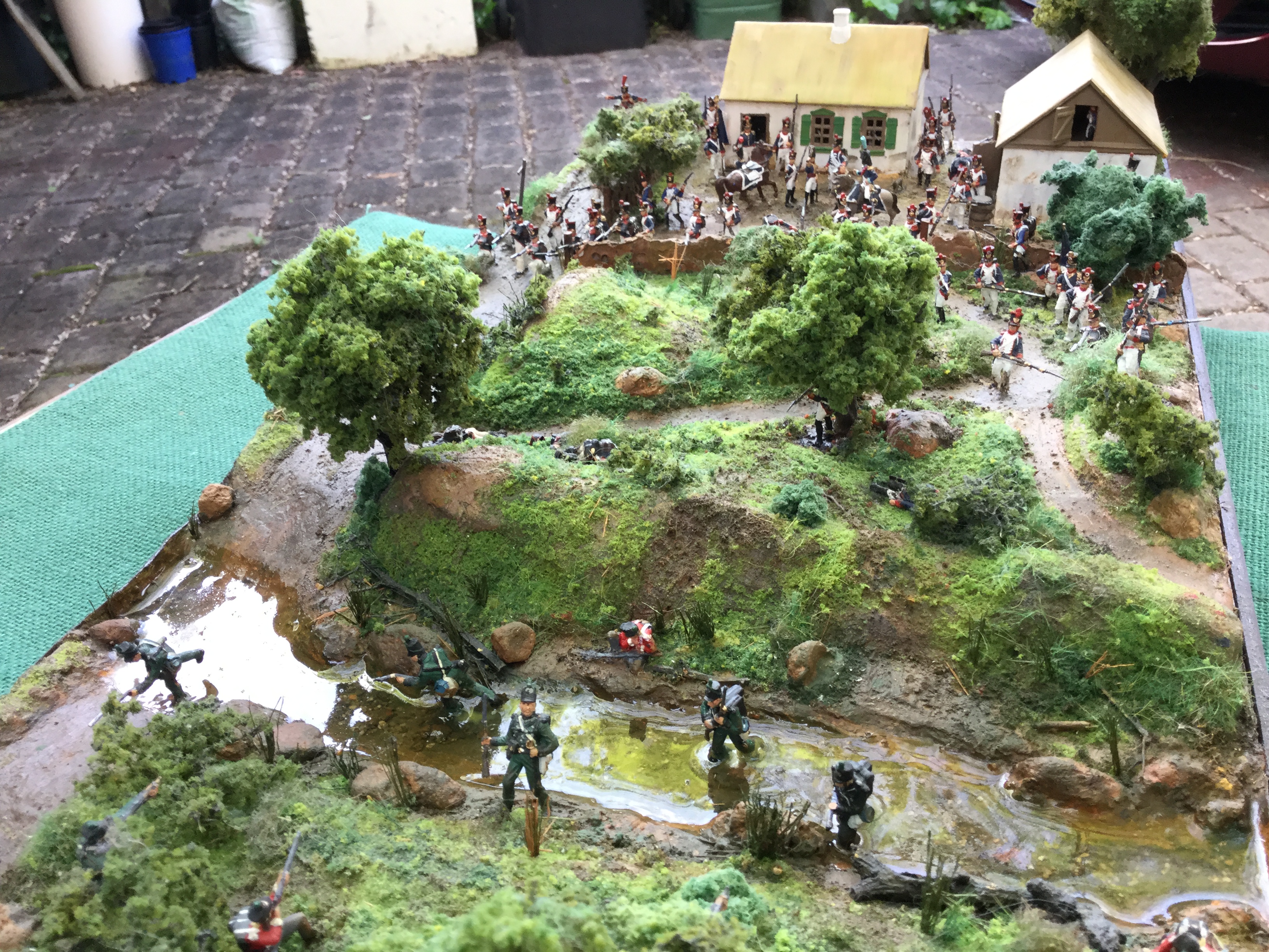 To tell you how long this diorama took me is a wild guess but let’s just say 2 hours a night for 3 to 4 months and a bit on weekends. When I have an idea my mind goes straight to the base and I construct this first (this will take me about 2 days). With the base made and painted the best part comes. I begin to landscape trees and rocks and finally place the men. This stage took a lot longer then my others, as I said it needed to be expanded, let’s say around 20 hrs. The technique used on this one e.g. the way the figures are set into the base (*see: setting my first figures) has changed after some clever person out there pointed me in new direction (Thanks, it has sped up figure placement so much).