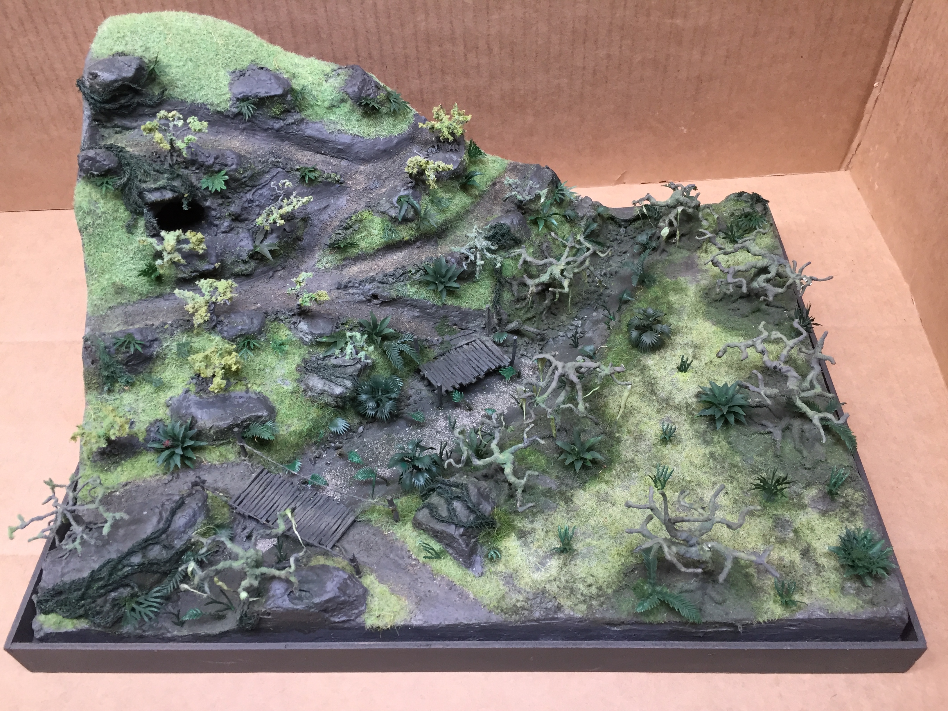 To those marvellous patient people that follow my blog, it does mean a lot to hear your encouragement and comments and I thank you. As you will know I’m working on the Swamp diorama, so this is a bit of an update to show that the foliage is done and I only need to paint up the figures, place them and then put in the water. I have used mostly bits of the palm trees and plants I used on the WWII dioramas. You keen eyed folk will notice straight away the only thing different is I painted them a less vibrant green, more suitable for a swamp.