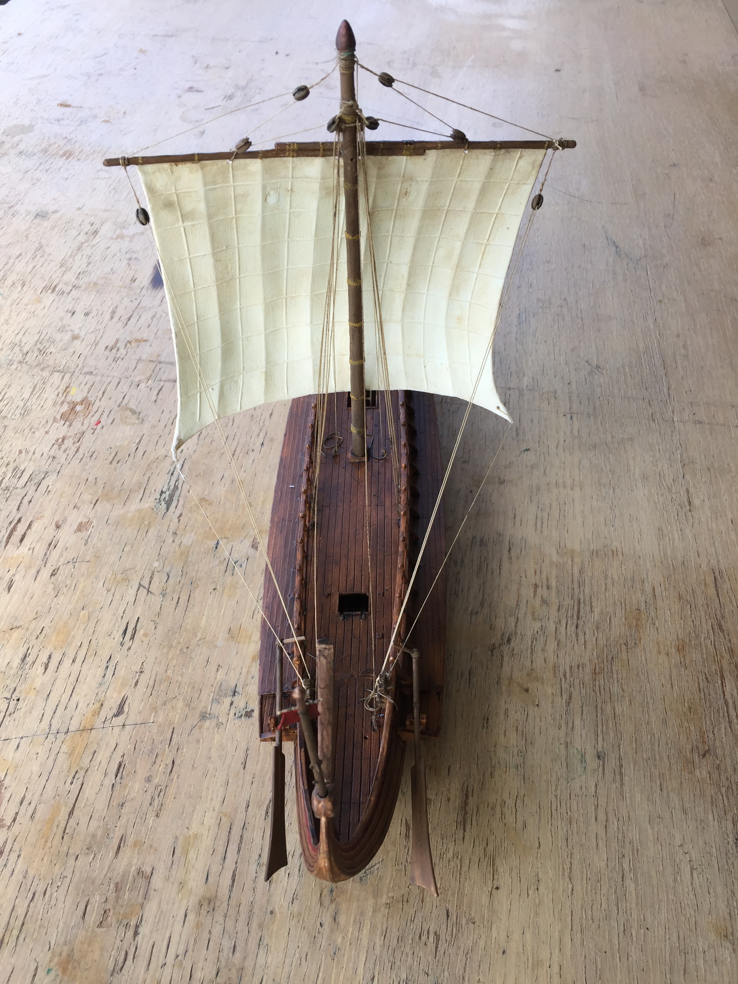Well I have managed to get this one done but those who know it will immediately notice a lot of changes – I’ll just go through them. Firstly, the castle and the canvas awning tent had to go, then the side of the deck where the rowers could be seen was filled in by using strips of balsawood (mind you this was after painting a set of oarsmen from Orien … AHH! … let’s just say it was too much trouble as they were hard to fit in. Then I thought, bugger the oars, I’ll just pretend they have shipped them and are getting ready for action! So yeah a few changes but I feel it will suit the show and probably fit in better without the oars. Lastly, the shields didn’t suit at all, very chunky … again I only thought of that after painting them!