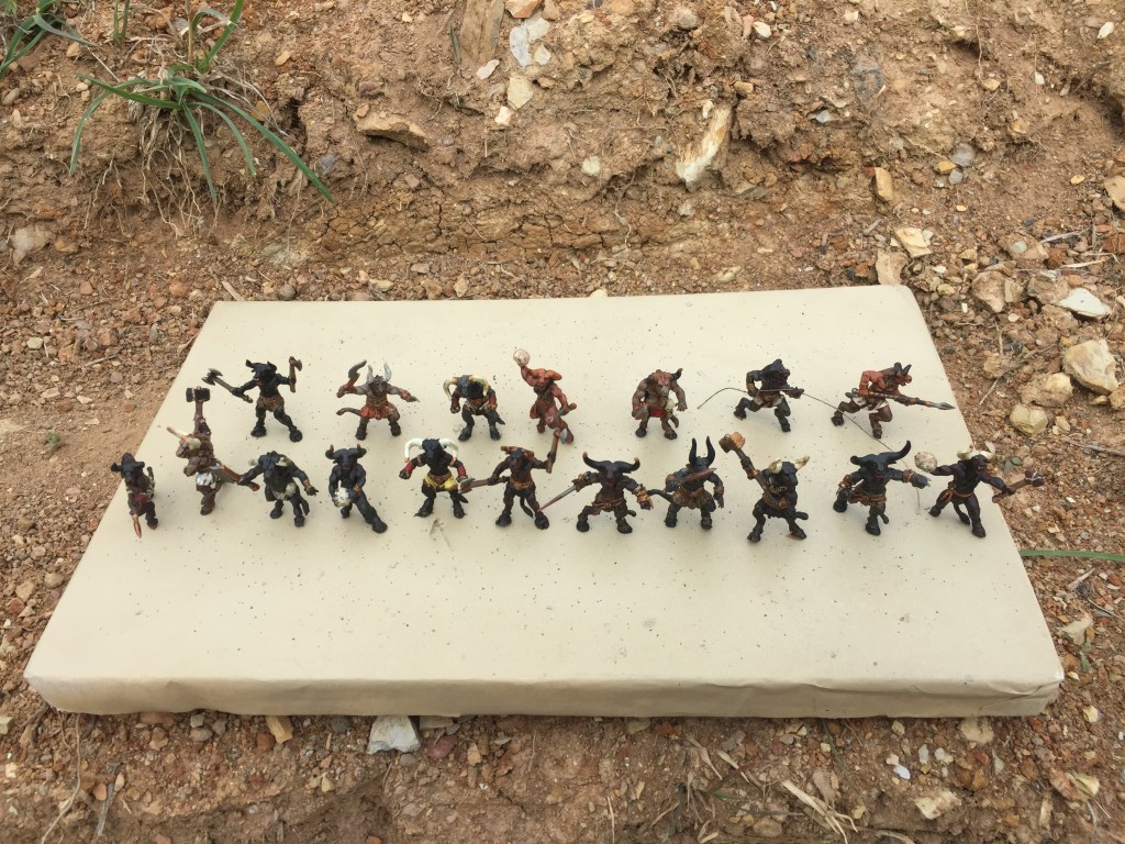 Well today I finished off painting a new set from Dark Alliance; Minotaur’s set no 047. They are a little taller than the normal 1/72 scale, roughly 30mm high, that’s to the top of their heads not the horns. An interesting group that I hope to incorporate in the upcoming show, I’m only waiting on one more set and I’m done with figures. Then it’s down to work on the bases. I have shown 18 figures but there are only 8 poses x 32 sprues which gives you 32 figs. The extras are ones I have boiled and twisted into different poses.
