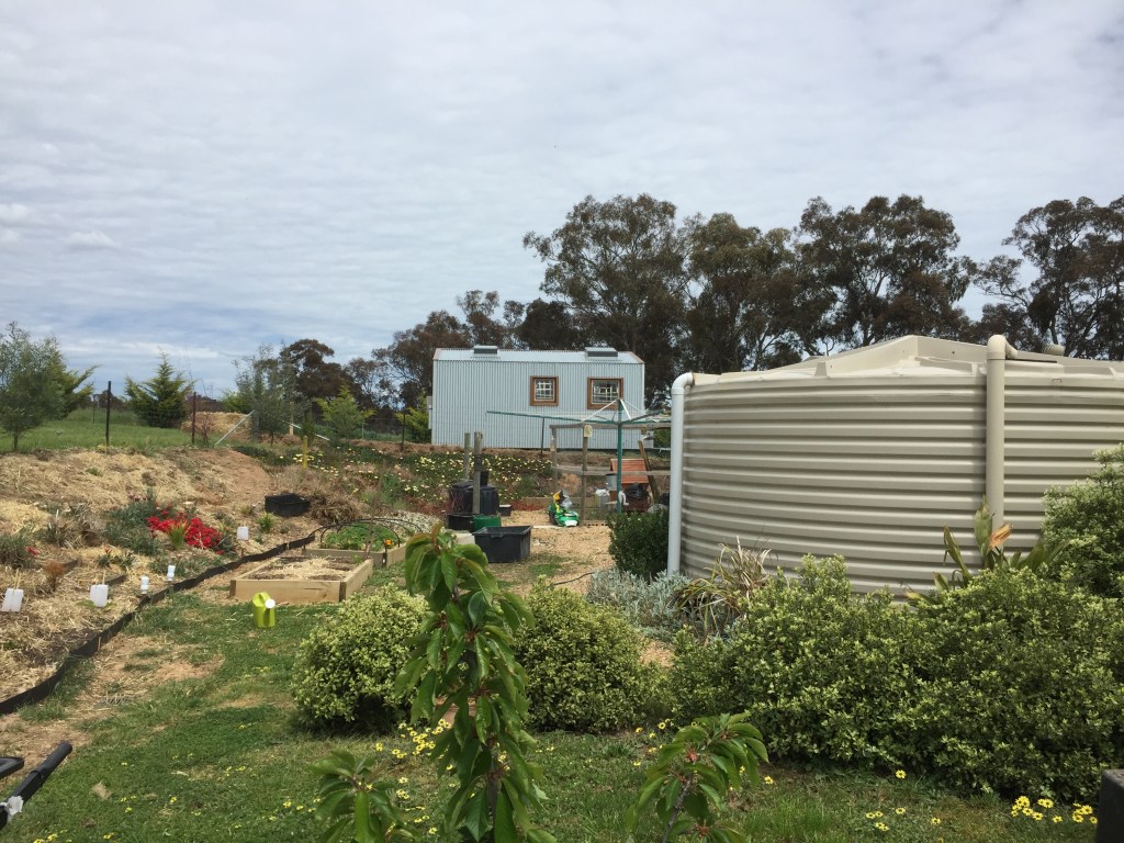 We finally got the Tiny House site excavated and levelled and our ever resourceful neighbour was able to tow it into its final position. It is Spring here so we are busy in the gardens, what with the orchard and the vegetable plots needing heaps of attention let alone the ornamental one, that’s what happens when you buy a big block!!!