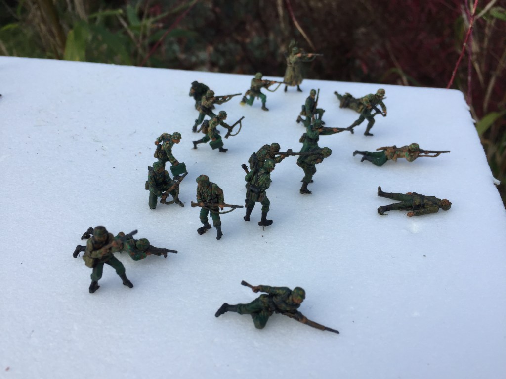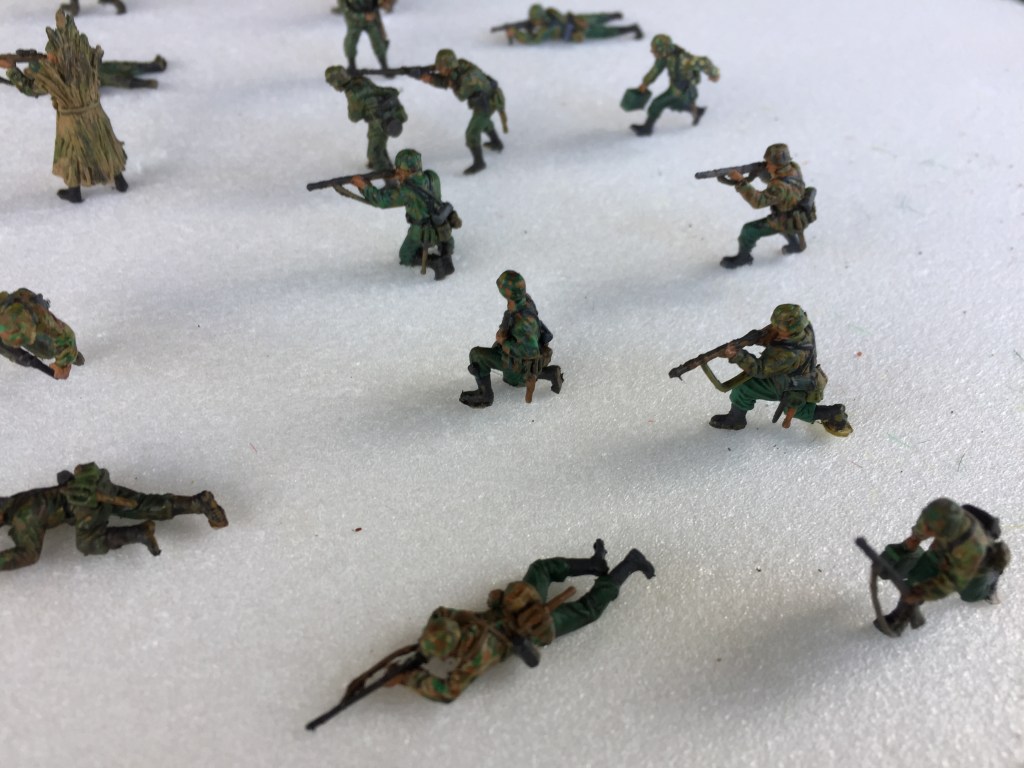I have chosen two sets, they are the Waffen SS sets and have rated well on the PSR (1/72 Plastic Soldier Review). You can check them out in more detail on their site if you are interested. The two sets go well together which is a real plus if you want to do a smallish diorama, the poses are active and realistic. I painted them with my usual Acrylics followed by a wash and a spray of Acrylic Matt Varnish. Well that’s it for the moment I will post the others in a day or two.