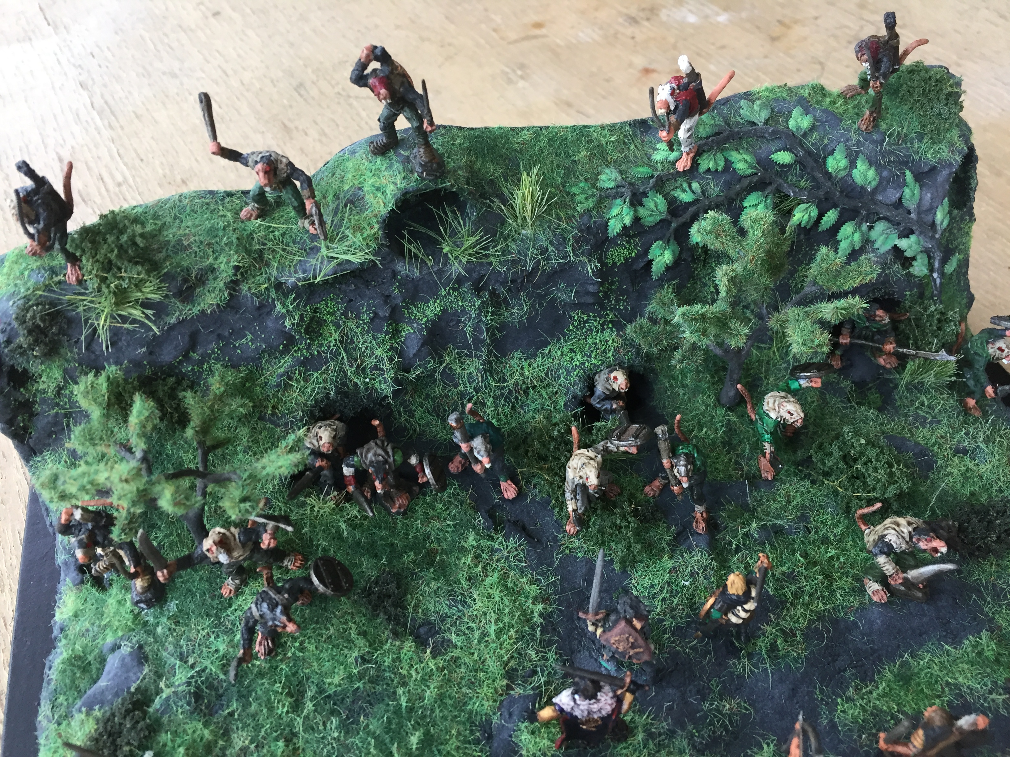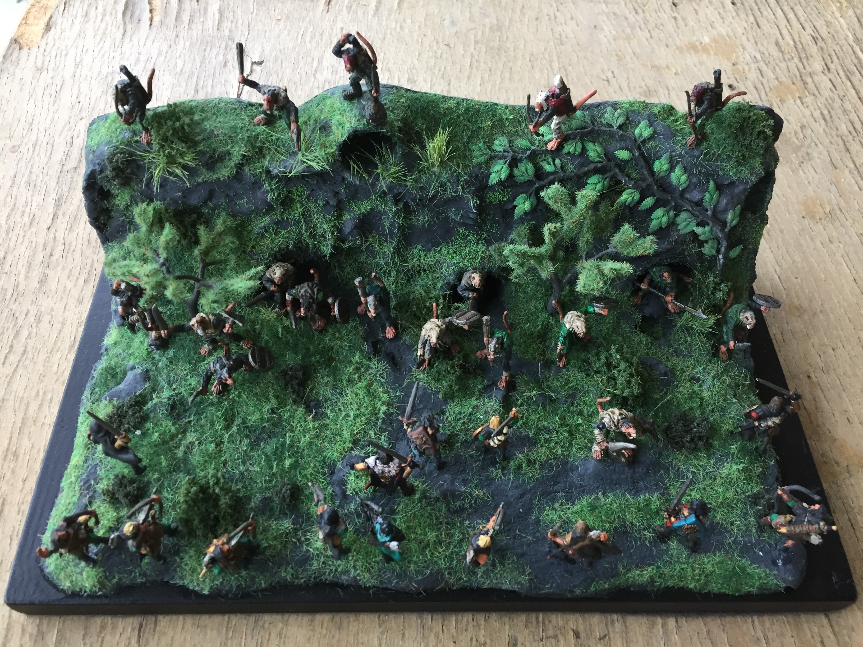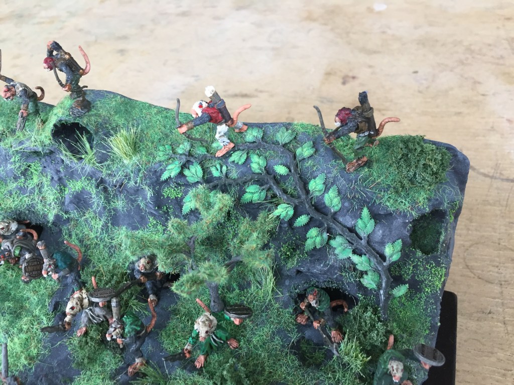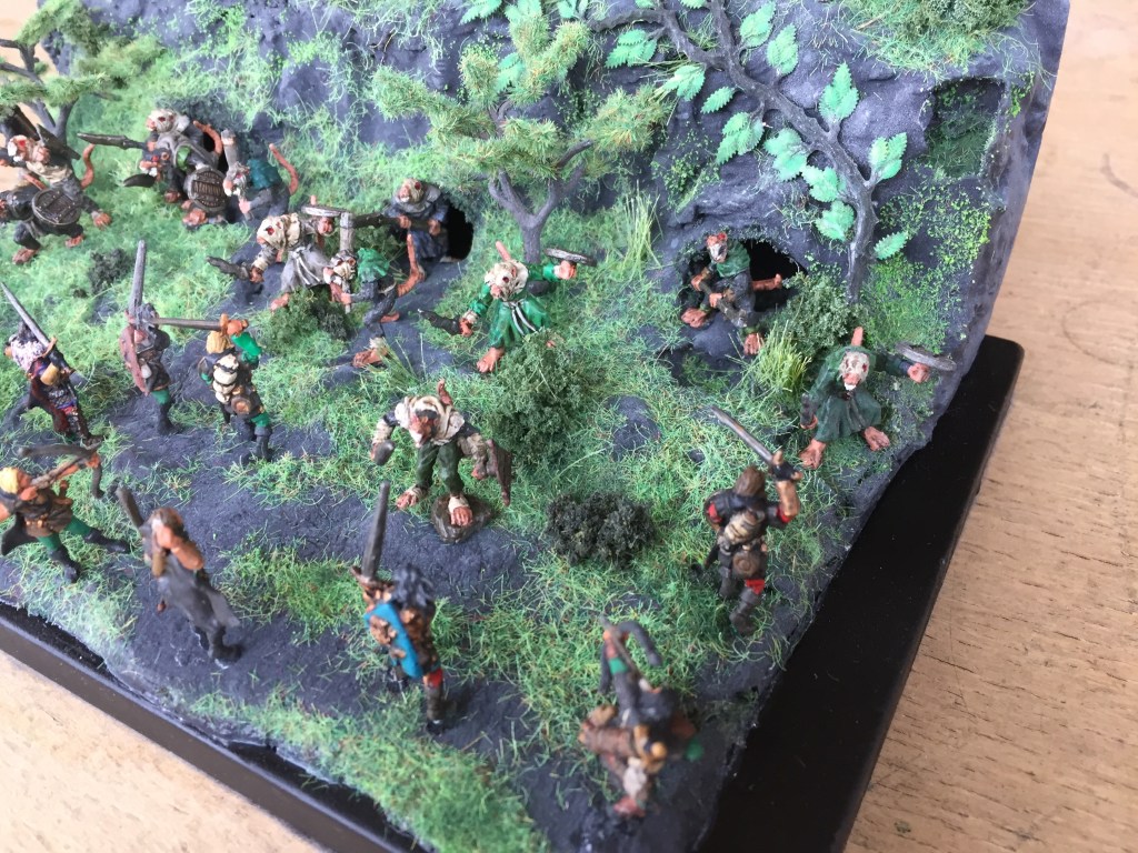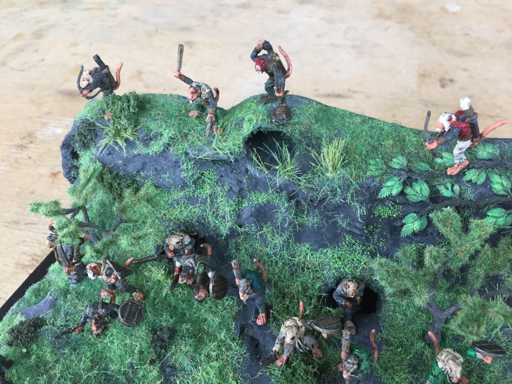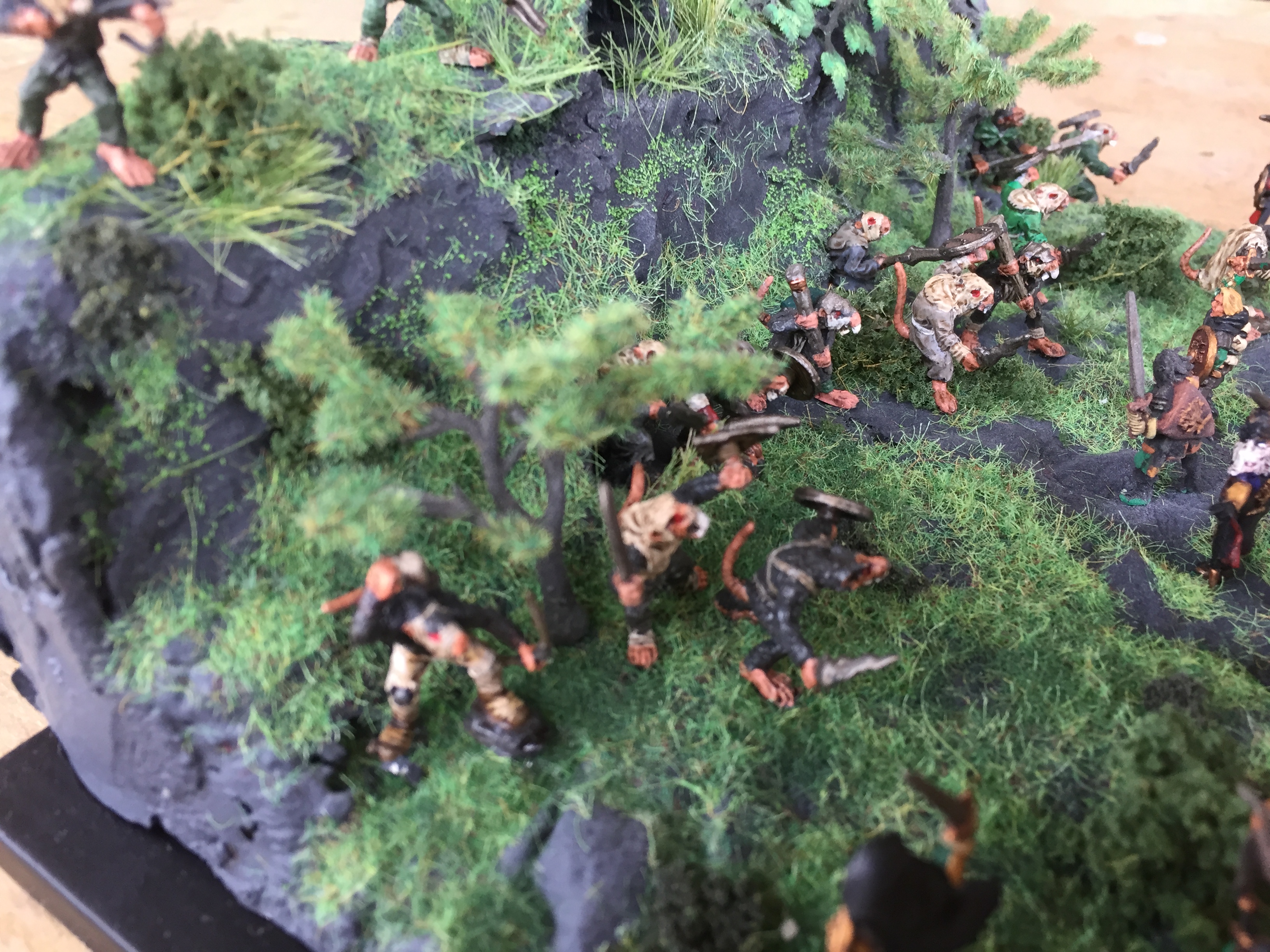 For the other I have used my newly acquired Rat Men from Caesar, they are pretty good in my opinion with a nice variety of poses. The terrain is just made from foam board and Plaster of Paris and the rat holes are made out of cardboard tubes that I removed when all was set. I then threw in the Dark Alliance Southern Kingdom Warriors, some wire trees and a section of vine from Citadel that I found in the Warhammer shop in Bendigo that our own Guru Pig pointed out to me. I had a great time talking to the owner (another βDaveβ) and learnt quite a bit about painting. Cheers Dave, I hope to be back for that painting lesson!