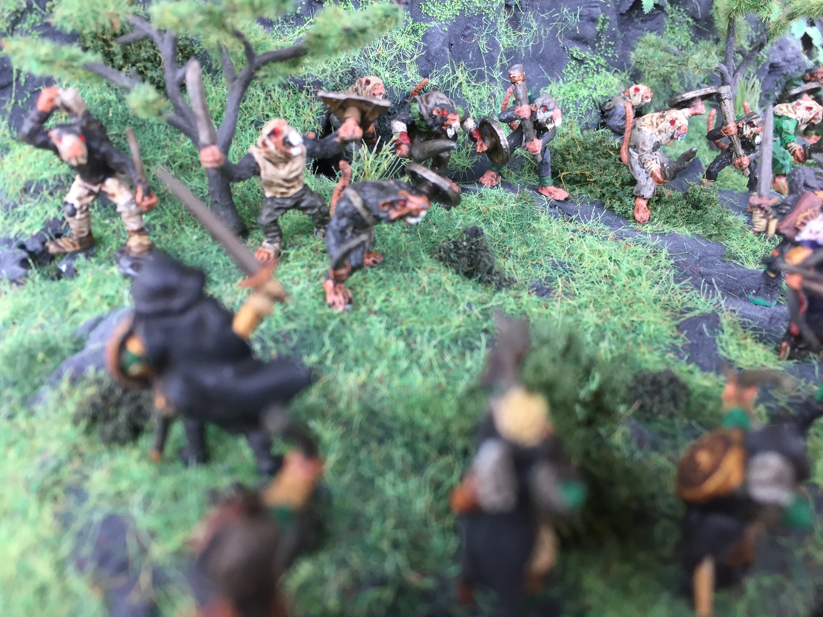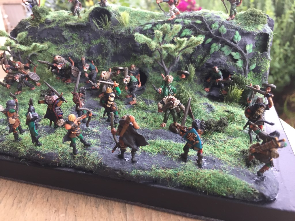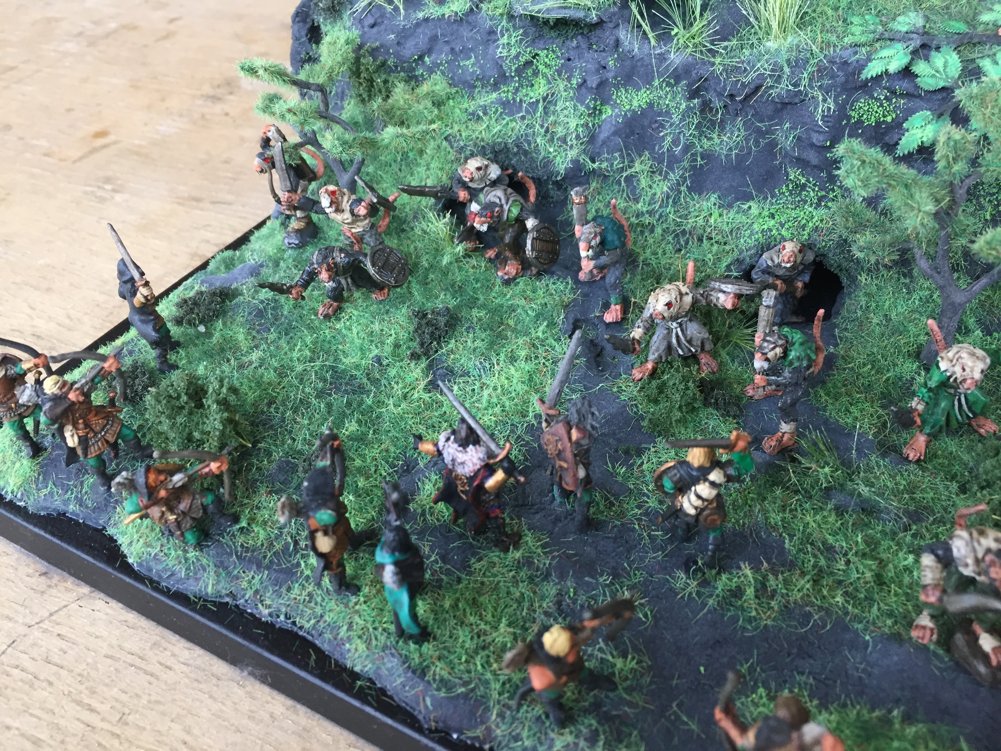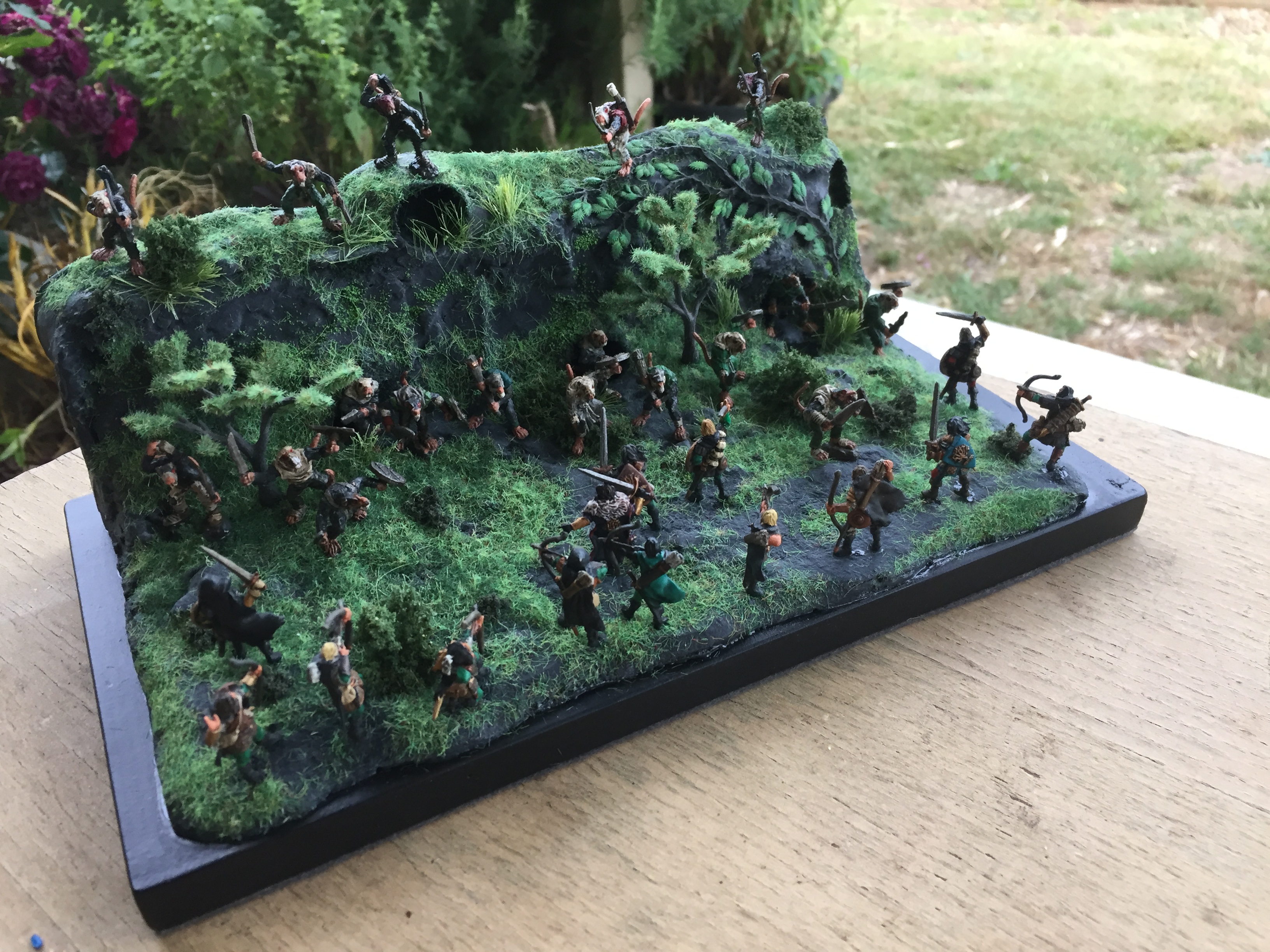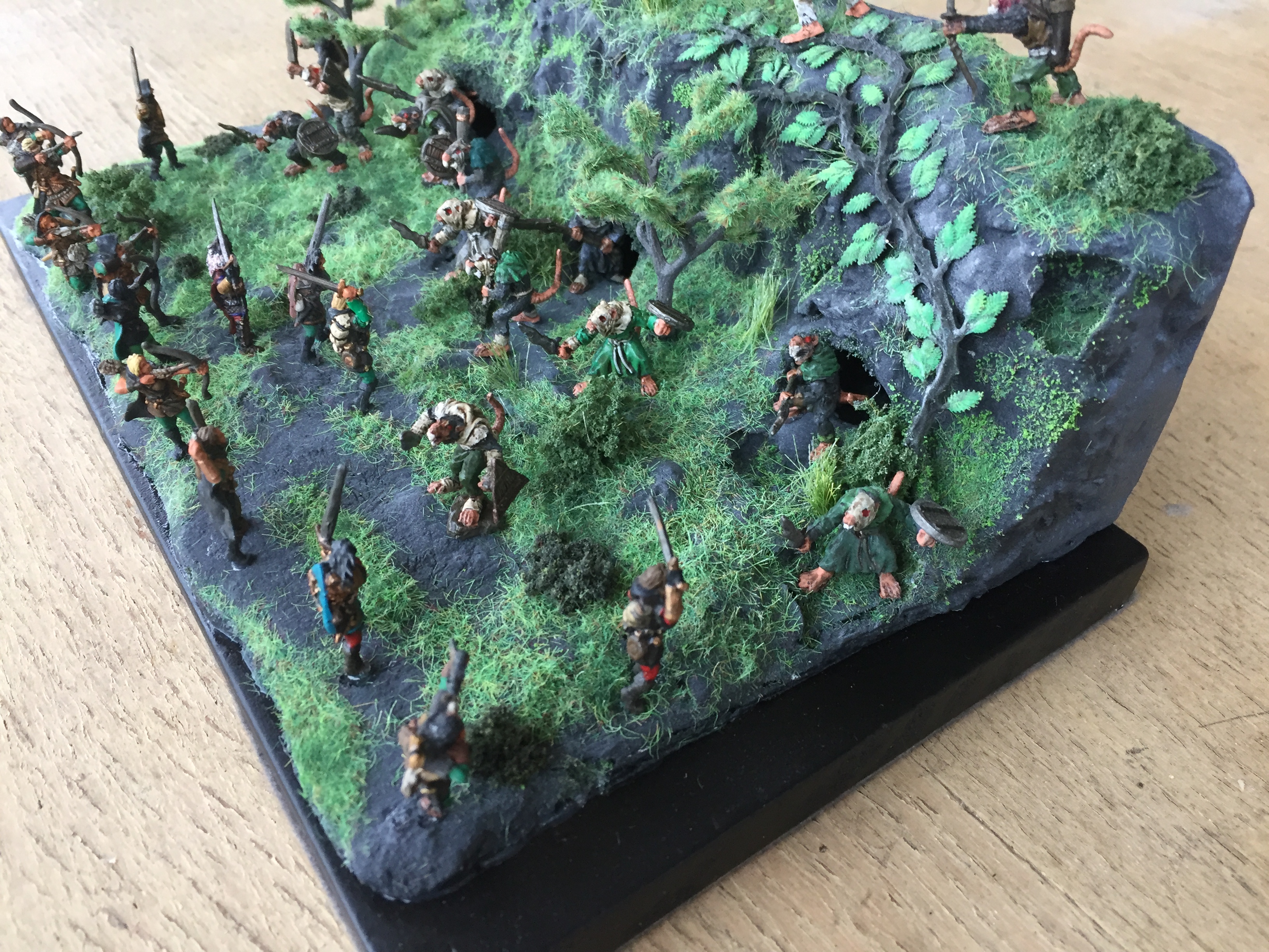 For the other I have used my newly acquired Rat Men from Caesar, they are pretty good in my opinion with a nice variety of poses. The terrain is just made from foam board and Plaster of Paris and the rat holes are made out of cardboard tubes that I removed when all was set. I then threw in the Dark Alliance Southern Kingdom Warriors, some wire trees and a section of vine from Citadel that I found in the Warhammer shop in Bendigo that our own Guru Pig pointed out to me. I had a great time talking to the owner (another βDaveβ) and learnt quite a bit about painting. Cheers Dave, I hope to be back for that painting lesson!