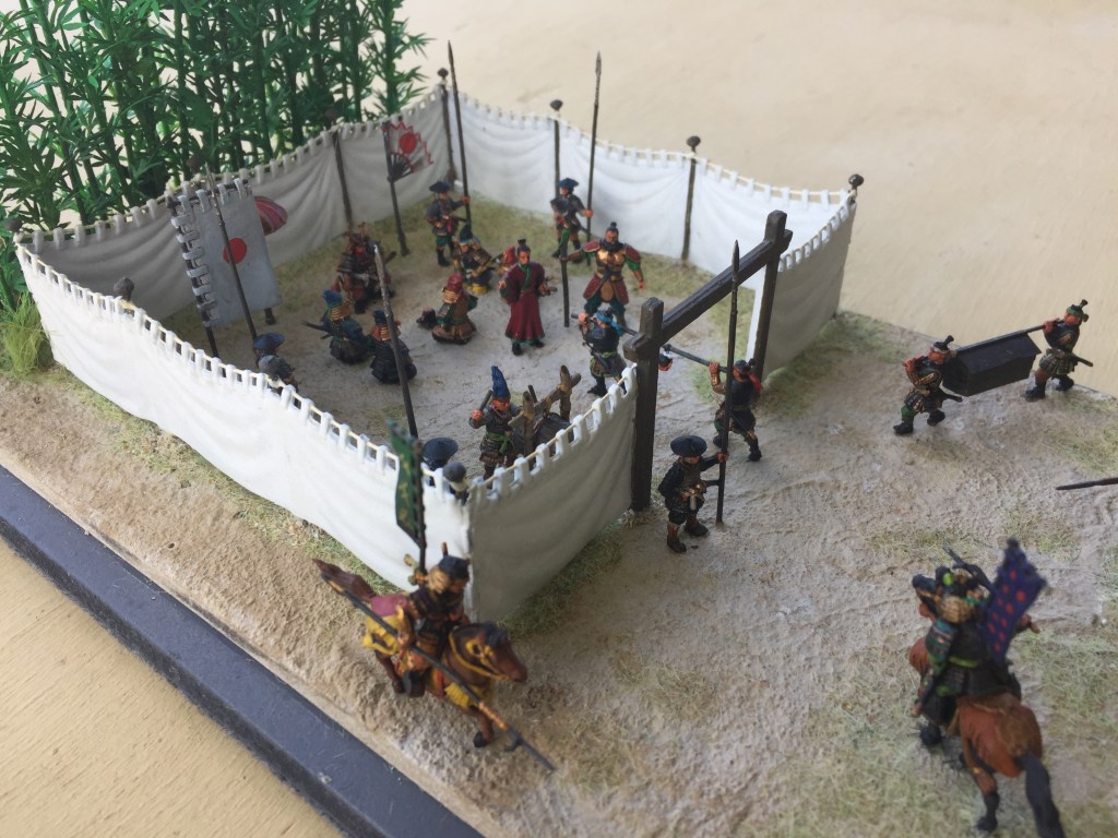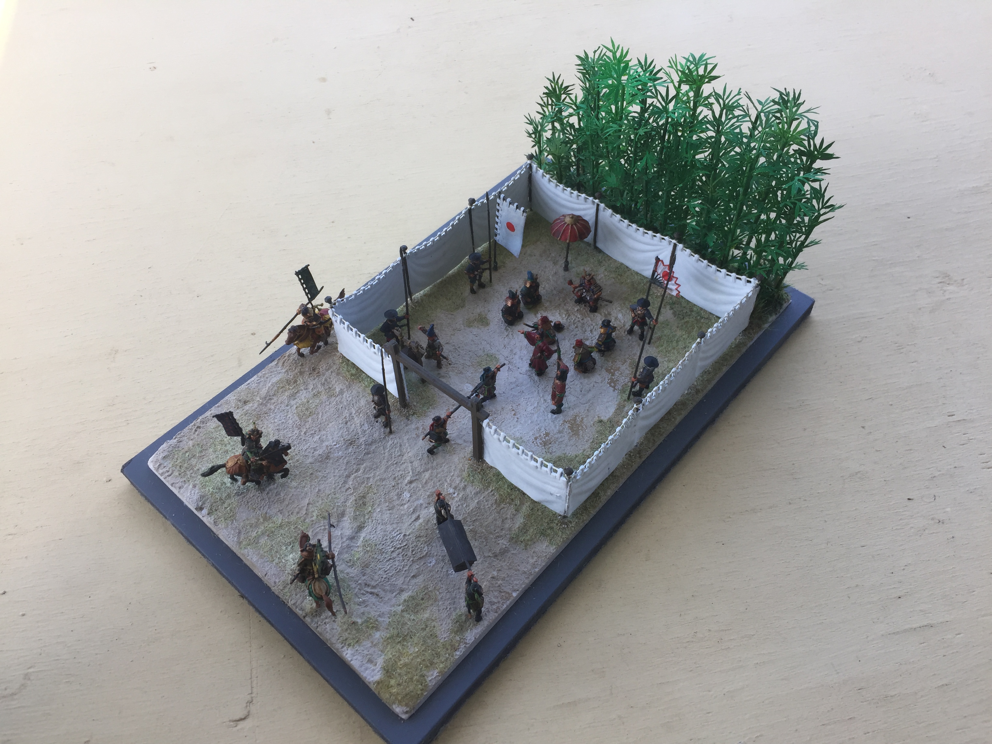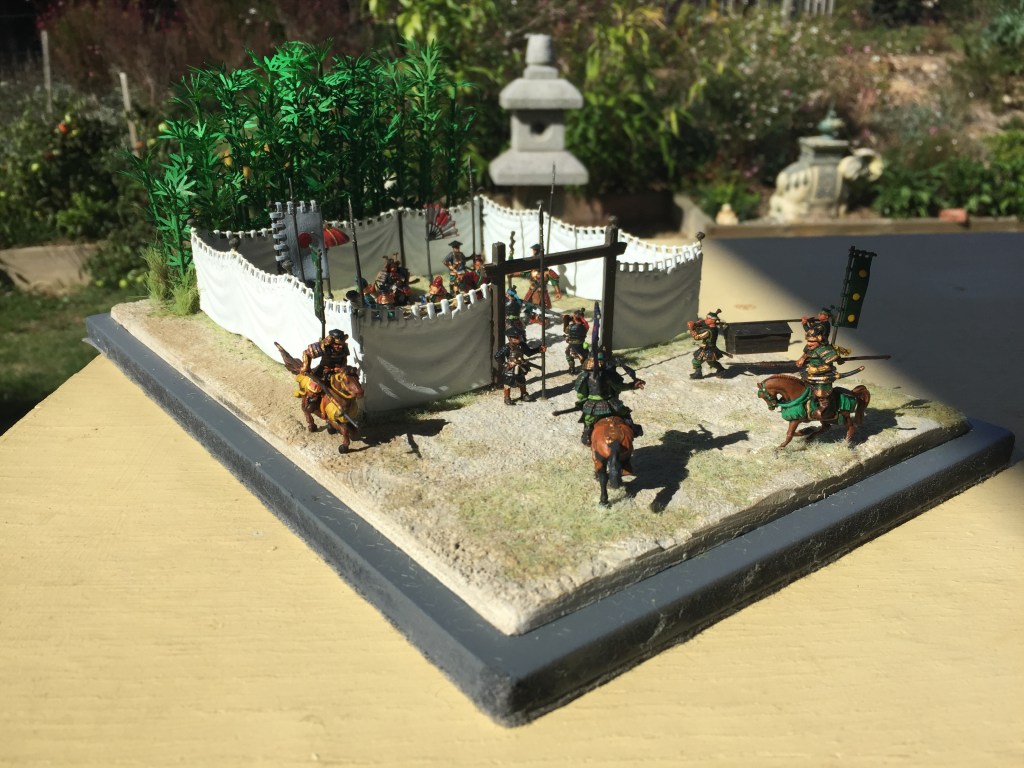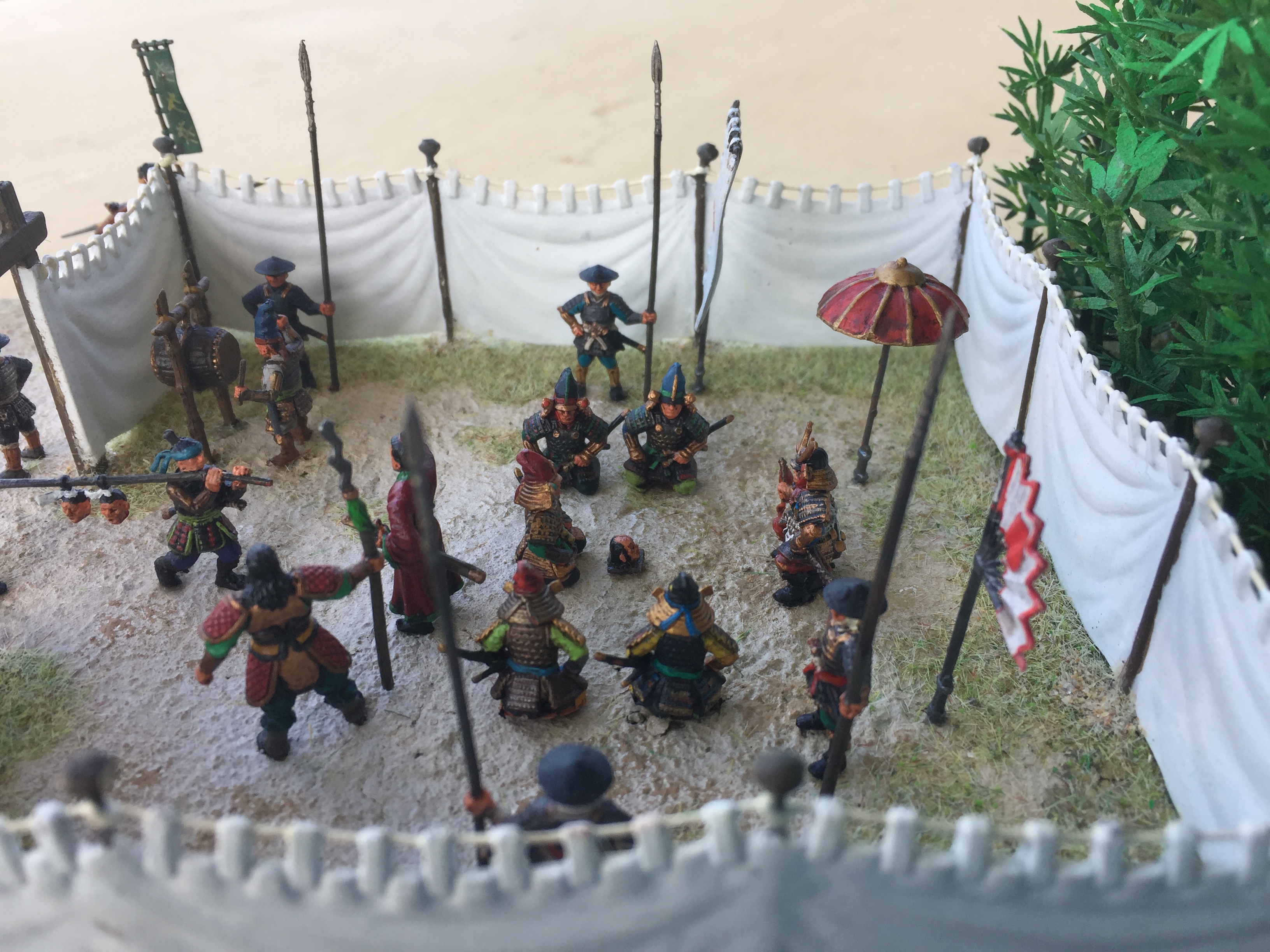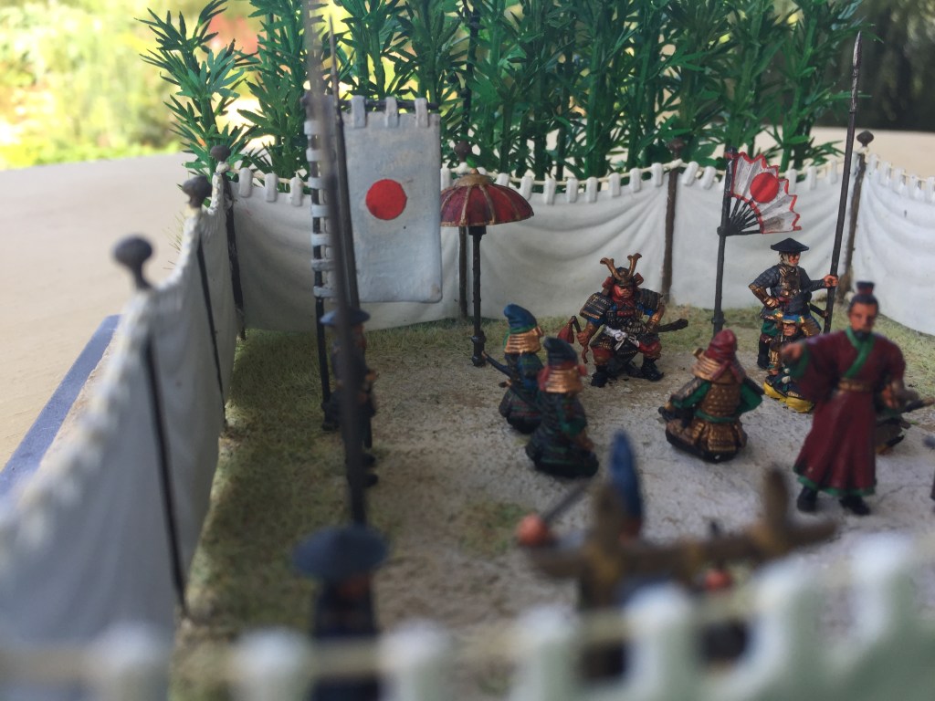 Anyway on with the show!   As usual this one is pretty simple.  It’s another fine set of Zvezda titled Samurai Army Headquarters 8029.   Thinking of how to set this up was a bit of a problem until I remembered my trusty bamboo.  Placing the screen against it seemed to work out ok by adding a bit of colour to the whole scene.  I have pretty well followed the layout as shown on the box artwork but instead of the Ninja in the tree, I have placed two in the bamboo (I’m not sure if one is visible in the photos) and added a few cavalry from the other set.  I have also used two figures from the Caesar Three Kingdom’s Set 1, (TK001) as I felt I needed them, as one doesn’t just wander in with a couple of heads on a pole and just stand there in front of the boss who is already admiring one.