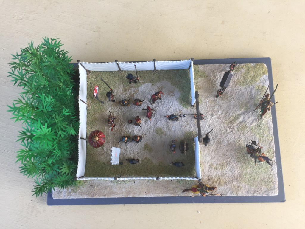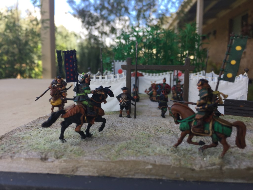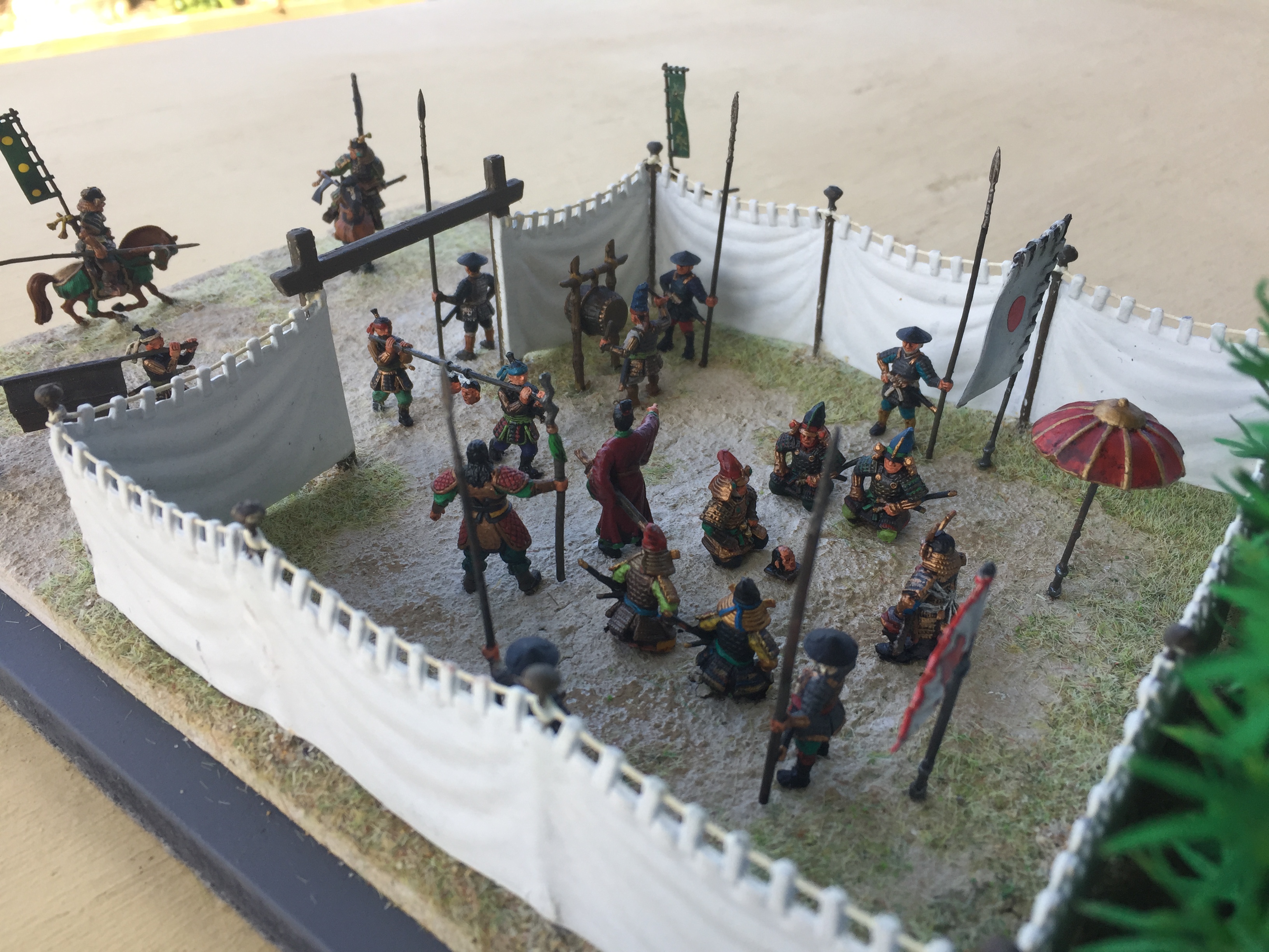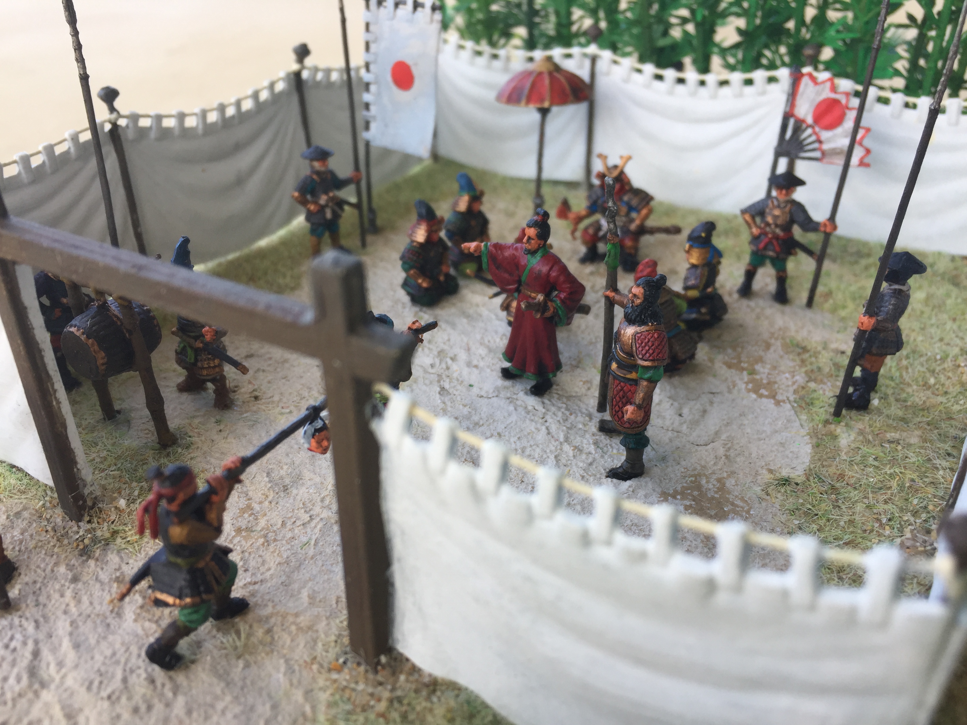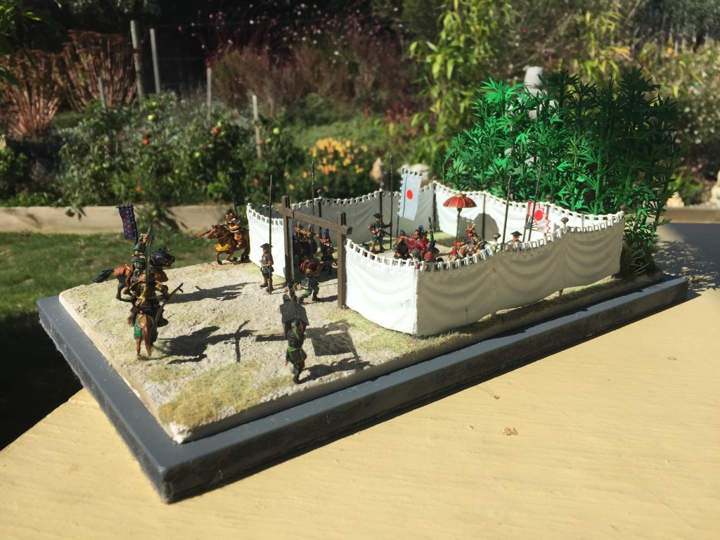 Anyway on with the show!   As usual this one is pretty simple.  It’s another fine set of Zvezda titled Samurai Army Headquarters 8029.   Thinking of how to set this up was a bit of a problem until I remembered my trusty bamboo.  Placing the screen against it seemed to work out ok by adding a bit of colour to the whole scene.  I have pretty well followed the layout as shown on the box artwork but instead of the Ninja in the tree, I have placed two in the bamboo (I’m not sure if one is visible in the photos) and added a few cavalry from the other set.  I have also used two figures from the Caesar Three Kingdom’s Set 1, (TK001) as I felt I needed them, as one doesn’t just wander in with a couple of heads on a pole and just stand there in front of the boss who is already admiring one.
